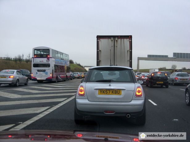 Heute fahre ich mit dem Bus nach Leeds. Warten an der Haltestelle. Der Doppeldeckerbus kommt und es sieht für einen Moment so aus, als ob er rückwärts an die Haltestelle fährt. Hand zur Strasse heben und signalisieren, dass man mitfahren möchte. Ich scheine hinten einzusteigen, aber da sitzt ja auch der Busfahrer. Er grüsst nicht einmal. Schade. Ich suche den Scanner, wo ich mein Busticket entwerten kann. Hab doch glatt das kleine Fenster in der Abtrennung zum Fahrer übersehen. Der sagt immer noch nichts. Ist normal bei First Bus erklärt mir später mein Freund. Oben im Bus hat man einen tollen Blick auf die Landschaft. Beim Runtergehen schaukelt es extrem. Aber gute Busverbindung!