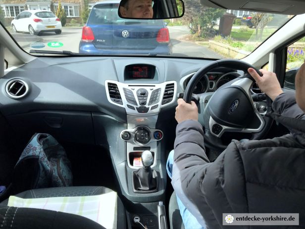 Wer sich in England zum ersten Mal in ein Auto setzt findet innen alles nach rechts verschoben. Es ist zum Glück nicht alles spiegelverkehrt. So finden sich Blinker und Scheibenwischer an der selben Stelle und Gas, Bremse und Kupplung sind wie gewohnt angeordnet. Der Schaltknüppel ist aber in der Mitte. Es erfordert dann im Zusammenspiel von dem Beachten des Verkehrs und dem Schalten mit der linken Hand hohe Konzentration. Mit einem Automatikwagen ist das bestimmt leichter.